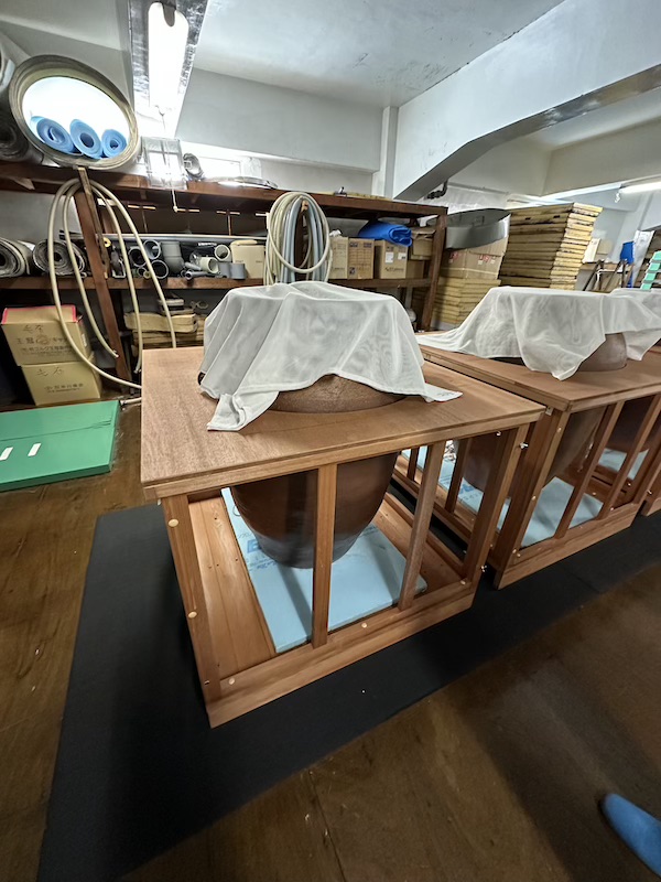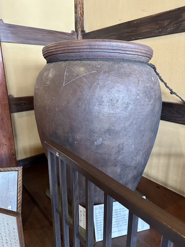 小嶋総本店、安土桃山時代 創業当時の日本酒を再現した「甕仕込み」。醸造に耐えられる甕を造ることができる作家さんも今ではほとんどいないそうです。こちらの甕は、岡山・備前焼作家 松井氏の作品です。仕上がった酒はどこか陶器のミネラル分を感じました。